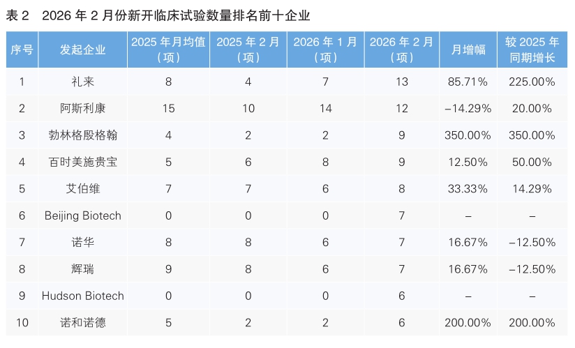 对新开临床试验的发起单位进行统计后发现,2月份发起临床试验最多的企业是礼来,新开临床试验13项,环比上升85.71%,同比上涨225%。其次为阿斯利康,新开临床试验12项,环比下降14.29%,同比增长20%。新开临床试验数量上升幅度最大的企业为勃林格殷格翰,新开临床试验9项,环比同比均增长350%。(详见表2)